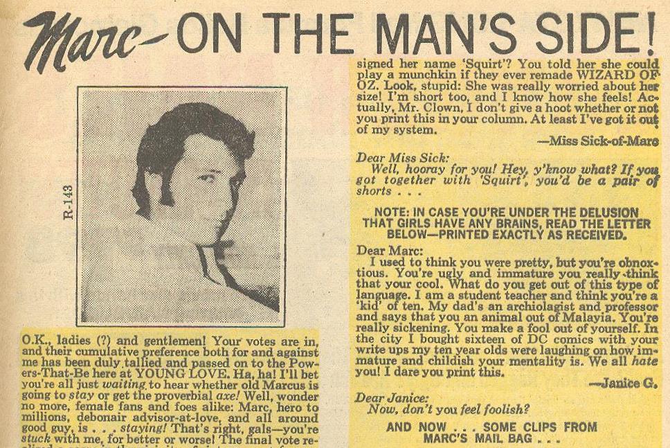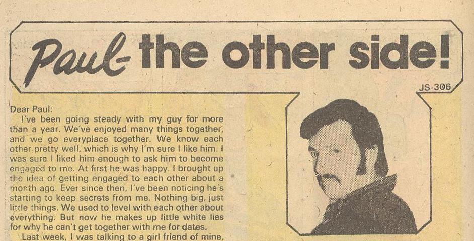 So I’m guessing these columns started in the late 60’s. I say guess because I can find no information on these guys and unfortunately I don’t have every romance comic in existence. The first one I saw was Marc and his advice shtick is to be a chauvinistic jerk. Later on I was introduced to Paul, apparently he’s Marc’s brother. Though I think hes the same guy with a mustache. Paul’s deal is he’s nice.